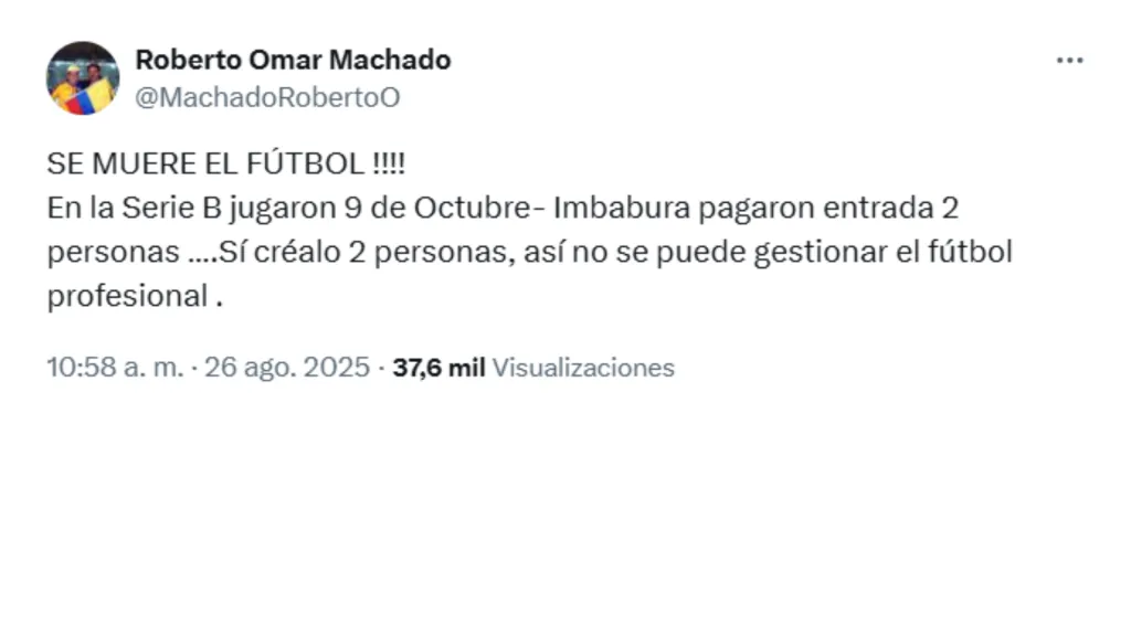 Según la confirmación de Roberto Omar Machado, para el partido de la Serie B entre 9 de Octubre vs Imbabura, apenas dos hinchas pagaron su boleto para entrar al estadio. Haciendo inviable que el club se sostenga desde este ingreso como pasa con otros equipos.