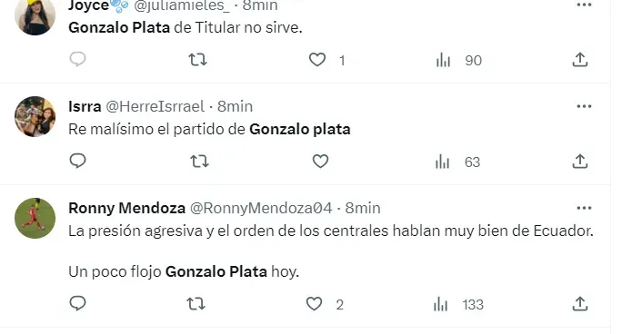 En redes sociales, los hinchas señalaron a Gonzalo Plata por su mal rendimiento en las pocas contras que tuvo Ecuador en ataque. El extremo no tomó buenas decisiones.