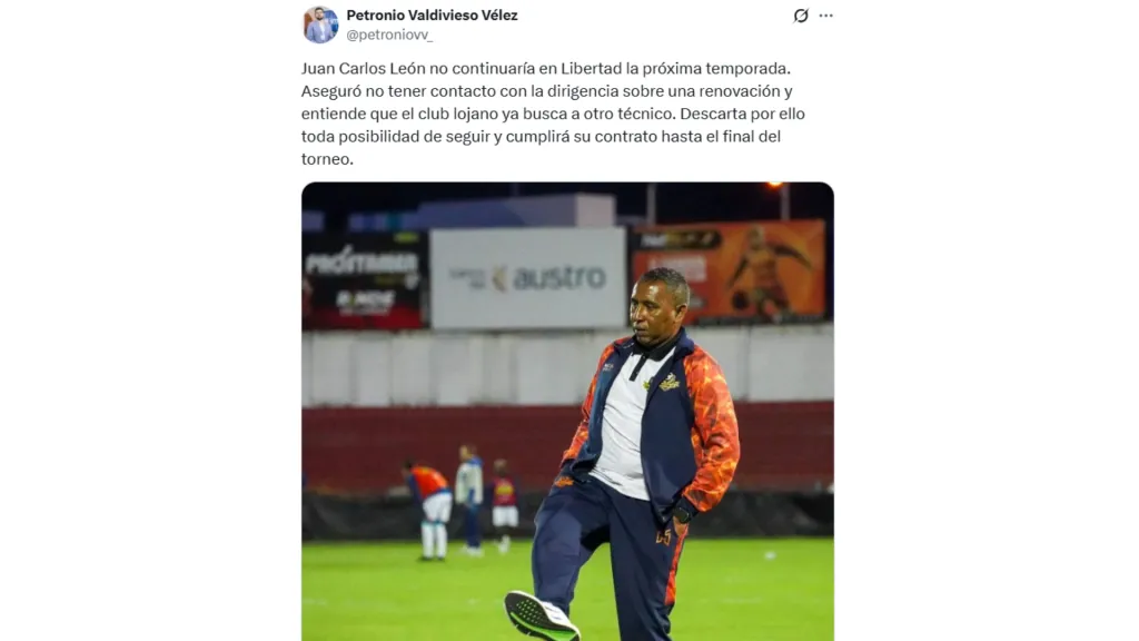 De acuerdo a la información de Petronio Valdivieso, Juan Carlos León no seguirá en Libertad para la temporada 2026. El DT no tiene contacto con la dirigencia por una posible renovación, y el entrenador ya descarta cualquier chance de seguir en Libertad.