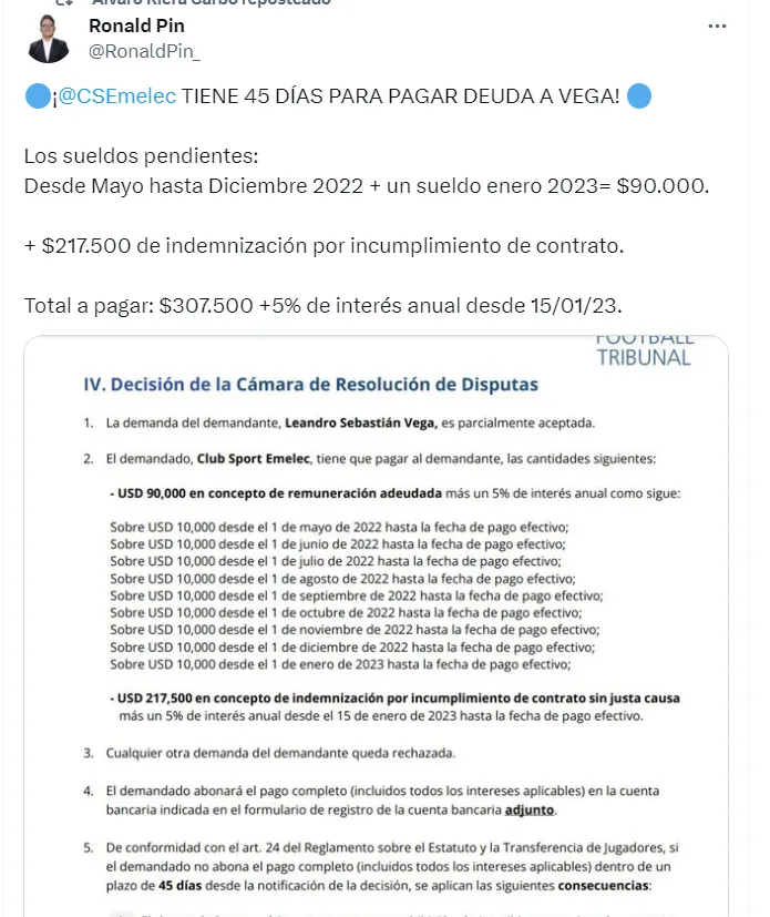 Emelec tendrá que pagarle a Leandro Vega un total de 307.500 USD más el 5% de interés anual. El ‘Bombillo’ tendrá que cancelar esta cifra hasta dentro de 45 días o se verá expuesto a más sanciones.