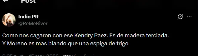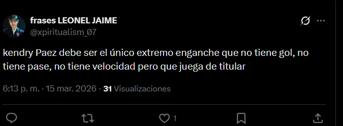 En redes sociales Kendry Páez tuvo reacciones mixtas por parte de los hinchas, mientras unos destacaban su precisión y fluidez para jugar, otros cuestionaron como se lo veía físicamente superado con facilidad. Tuvo que salir por molestias y los hinchas lo llamaron Kendry ‘Cristalez’, como indirecta de que es frágil por sus constantes lesiones.