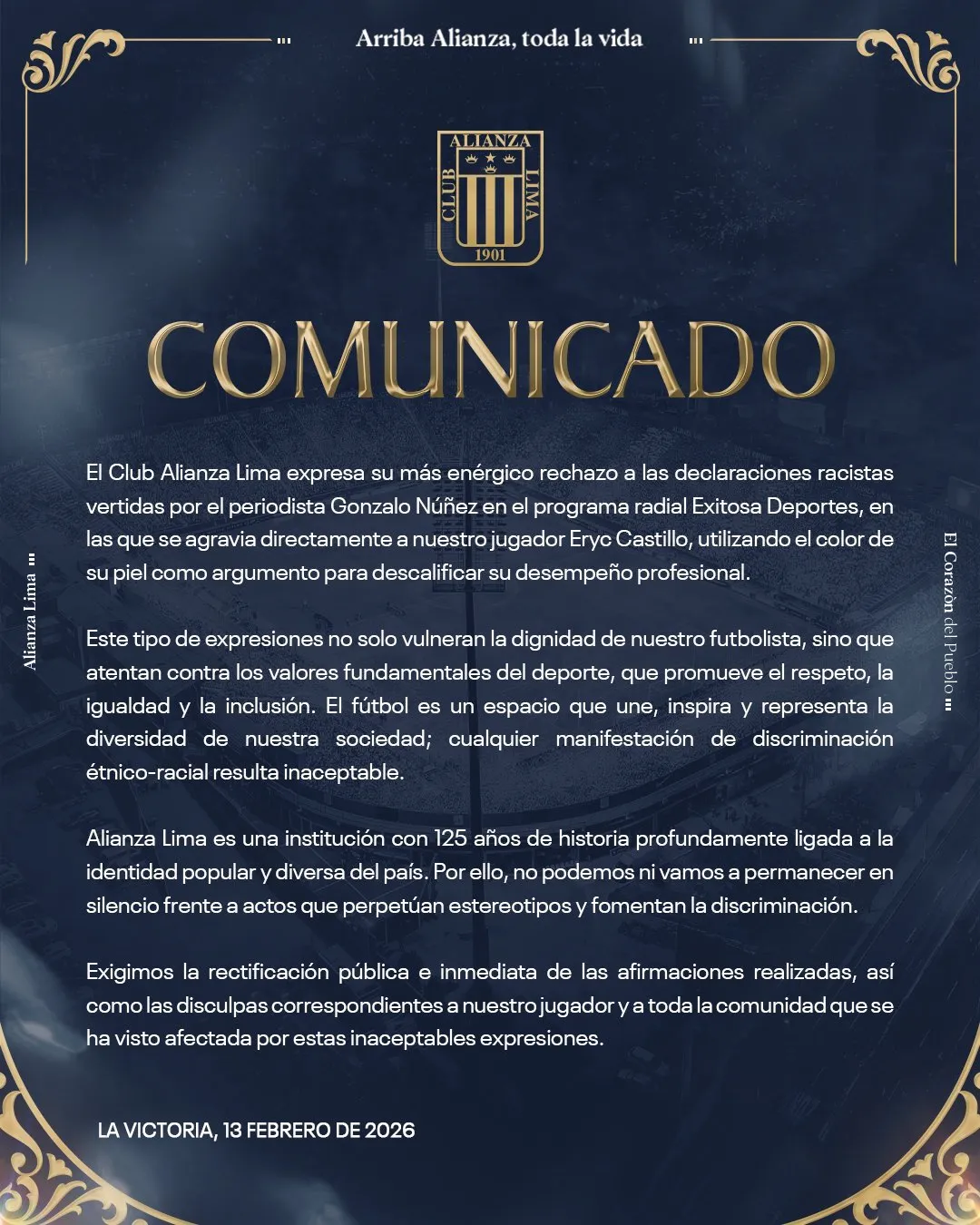 Además de los comentarios indignados de los aficionados recriminando, el propio Alianza Lima emitió un comunicado de apoyo a favor de su extremo ecuatoriano.