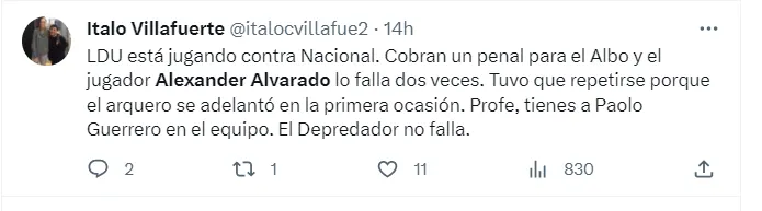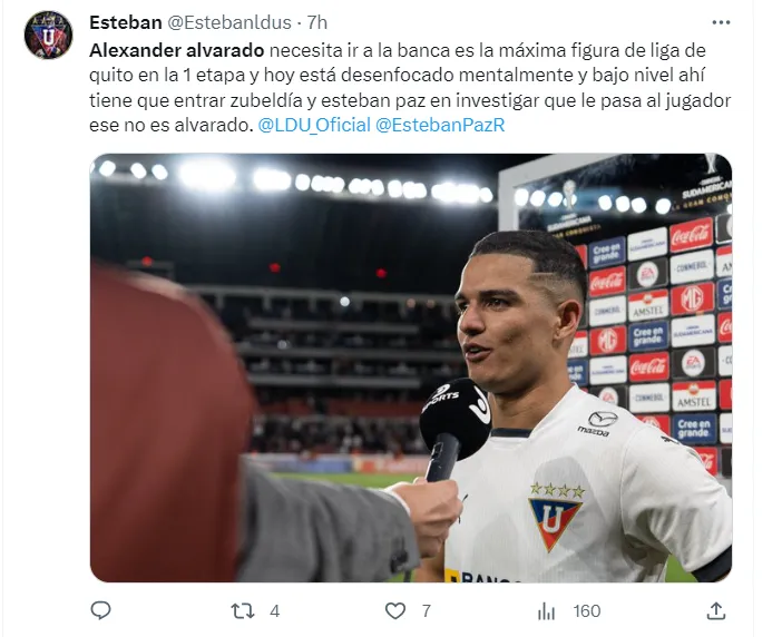 Mediante las redes sociales, hinchas de Liga de Quito se enojaron con Alexander Alvarado y lo criticaron por su doble falla. Al final LDU no pudo encontrar el gol y se marchó un tibio empate.