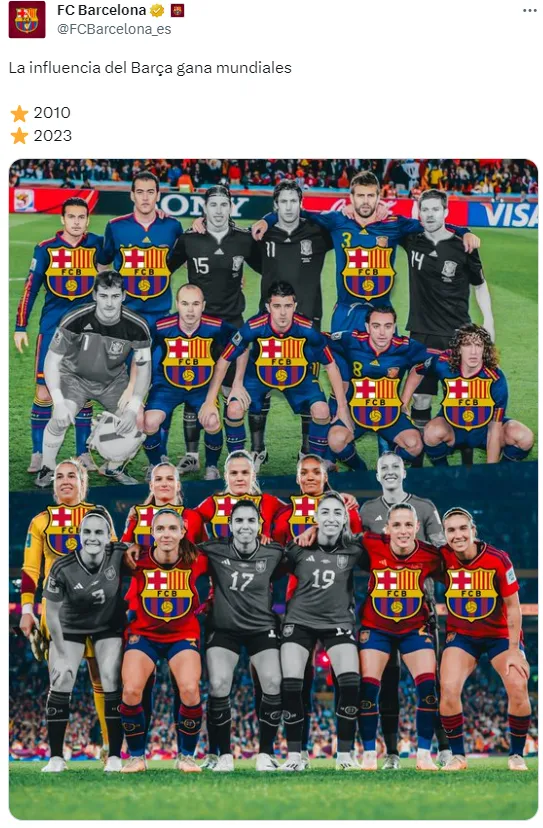 Aprovechando esta situación, FC Barcelona publicó una imagen en redes resaltando la cantidad de futbolistas del club azulgrana partieron en las formaciones titulares de ambas finales del mundo. “La influencia del Barça gana mundiales”.