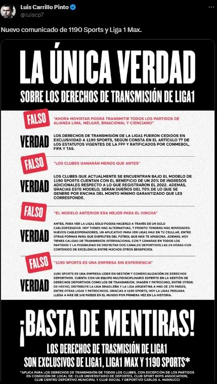 Lo tituló así en su cuenta de Twitter: “Nuevo comunicado de 1190 Sports y Liga 1 Max”. Para después dejar la hoja membretada por la propia entidad. Ahora, a nosotros en Bolavip nos toca transcribir lo que dicen desde la productora avalada por la Federación Peruana de Fútbol. En su versión más directa, hacia el Consorcio del Fútbol Peruano – GOLPERU.