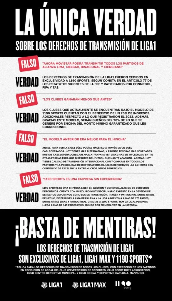VERDAD: los derechos de transmisión de la Liga 1 fueron cedidos en exclusividad a 1190 Sports, según consta en el artículo 77 de los estatutos vigentes de la FPF y ratificados por Conmebol, FIFA, TAS.