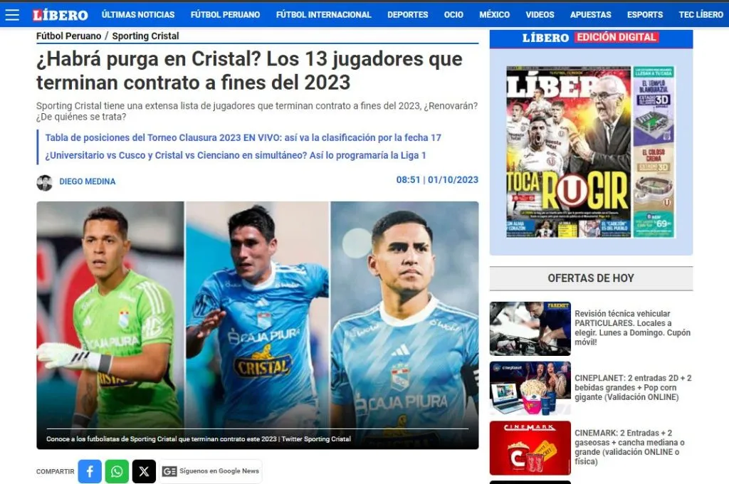 Mediante información verificada por el Diario Líbero, la situación en el Rímac se maneja de la siguiente manera: “Son 13 los futbolistas que terminan contrato con Sporting Cristal a fines del 2023. Es claro que hay varias que son titulares indiscutibles para Tiago Nunes, por lo que ya se verá qué decisión toma la directiva a fines de año”.