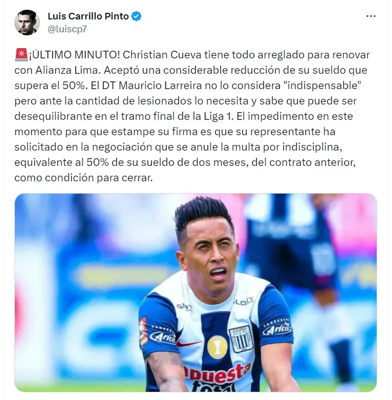 Brindando una extensa información en su cuenta de Twitter, Luis Carrillo Pinto precisó básicamente que Christian Cueva se redujo el salario considerablemente para seguir en Alianza Lima, pero que puso una condición.