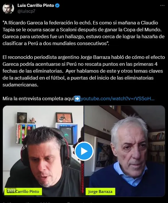 Dentro de la nota para su canal de Youtube, también se tocaron puntos muy generales: “El reconocido periodista argentino Jorge Barraza habló de cómo el efecto Gareca podría acentuarse si Perú no rescata puntos en las primeras 4 fechas de las eliminatorias. Ayer hablamos de este y otros temas claves de la actualidad en el fútbol, a puertas del inicio de las eliminatorias sudamericanas”.