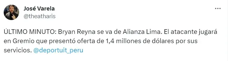 “ÚLTIMO MINUTO: Bryan Reyna se va de Alianza Lima”, así empezó el texto de José Varela. Dando más información de seguido, el periodista también dio los detalles.