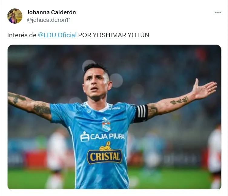 “Interés de Liga de Quito por Yoshimar Yotún”, escribió la comunicadora Johanna Calderón en su cuenta de Twitter.