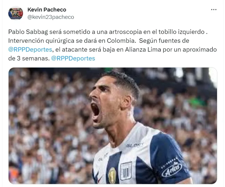 Kevin Pacheco de RPP Deportes: “Pablo Sabbag será sometido a una artroscopia en el tobillo izquierdo. Intervención quirúrgica se dará en Colombia. El atacante será baja en Alianza Lima por un aproximado de 3 semanas”.