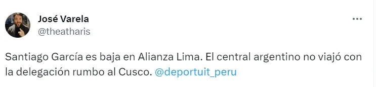 Llegando la información como una noticia de último minuto, el periodista José Varela comunicó en su cuenta de Twitter la desgracia. Revelando que el defensor Santiago García se lesionó, el periodista comentó que el zaguero quedó descartado para el duelo ante Cienciano.
