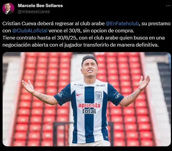 El abogado especialista en estas materias, Marcelo Bee Sellares, dejó en claro todo: “Cristian Cueva deberá regresar al club arabe Al Fateh Club, su prestamo con Alianza Lima vence el 30/8, sin opción de compra. Tiene contrato hasta el 30/6/25, con el club arabe quien busca en una negociación abierta con el jugador transferirlo de manera definitiva”.