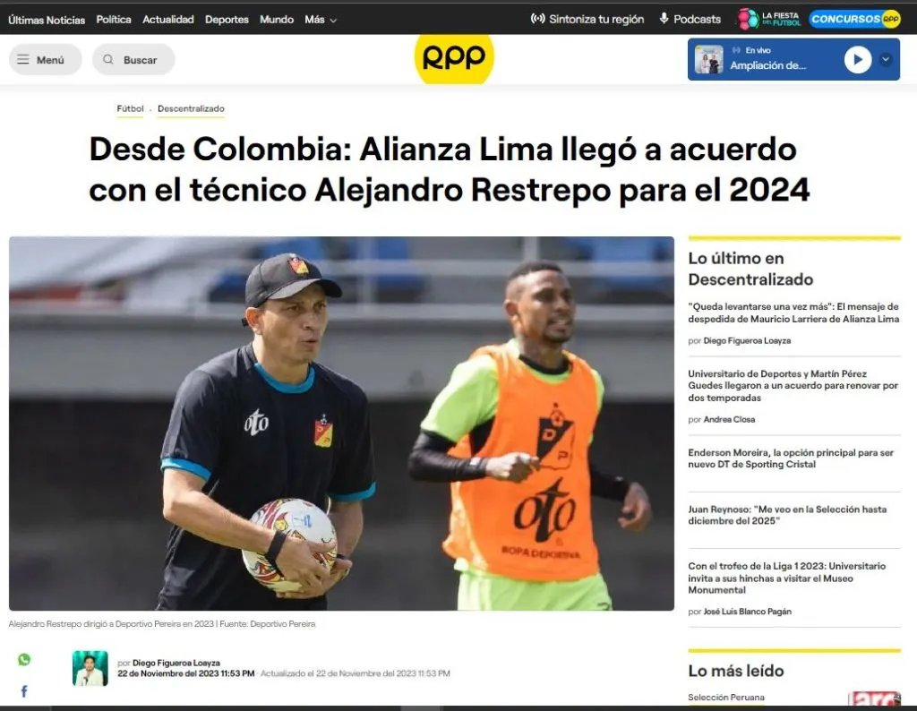 RPP Noticias, otra fuente consultiva de nivel, explica a su manera como se gestiona esta llegada: “Alejandro Restrepo es un entrenador de nacionalidad colombiana, de 41 años, en quien Alianza Lima puso la mira. El diálogo no tardó en prosperar y llegaron a concordar que el vínculo del estratega sea por todo el 2024. Solo la firma es lo único que falta para ponerle punto final a la operación”.