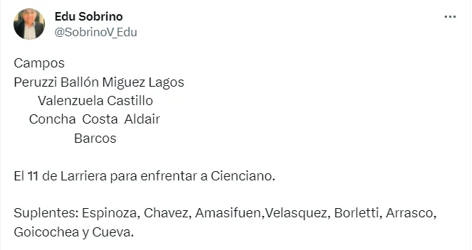 “Campos, Peruzzi, Ballón, Miguez ,Lagos, Valenzuela, Castillo, Concha, Costa, Aldair y Barcos, El 11 de Larriera para enfrentar a Cienciano. Suplentes: Espinoza, Chávez, Amasifuen, Velásquez, Borletti, Arrasco, Goicochea y Cueva”, escribió el comunicador en su cuenta oficial de Twitter.