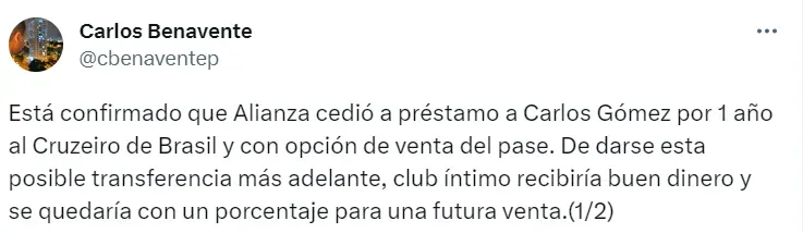 “Está confirmado que Alianza cedió a préstamo a Carlos Gómez por 1 año al Cruzeiro de Brasil y con opción de venta del pase. De darse esta posible transferencia más adelante, el club íntimo recibiría buen dinero y se quedaría con un porcentaje para una futura venta”, escribió el comunicador en su cuenta oficial de Twitter.