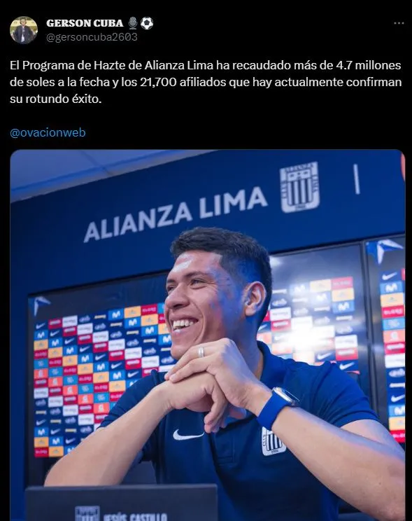 Mediante un mensaje en Twitter, el periodista Gerson Cuba precisó un detalle, considerado como un triunfo moral: “El Programa de Hazte de Alianza Lima ha recaudado más de 4.7 millones de soles a la fecha y los 21,700 afiliados que hay actualmente confirman su rotundo éxito”.