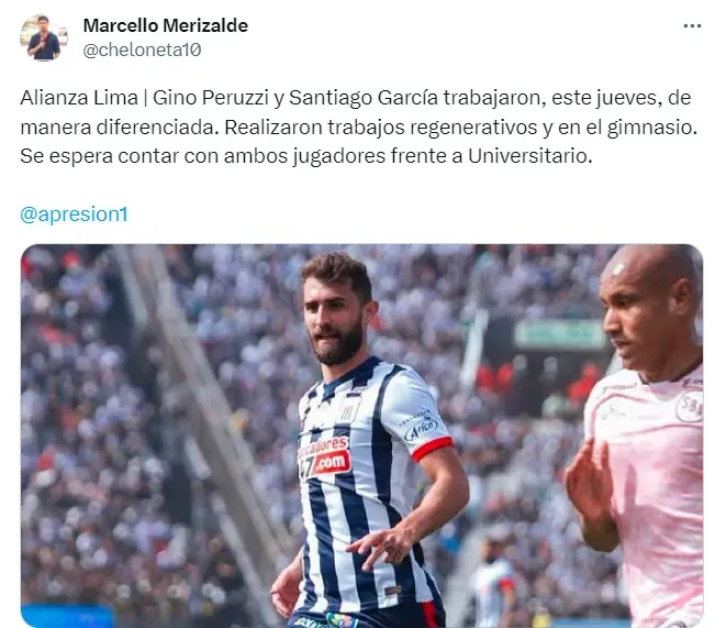 “Alianza Lima | Gino Peruzzi y Santiago García trabajaron, este jueves, de manera diferenciada. Realizaron trabajos regenerativos y en el gimnasio. Se espera contar con ambos jugadores frente a Universitario”, informó el periodista deportivo Marcello Merizalde a través de cuenta oficial de Twitter.