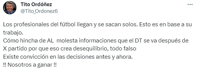 “Los profesionales del fútbol llegan y se sacan solos. Esto es en base a su trabajo. Cómo hincha de AL molesta informaciones que el DT se va después de X partido porque eso crea desequilibrio, todo falso Existe convicción en las decisiones antes y ahora. ¡¡Nosotros a ganar!!”, expresó.