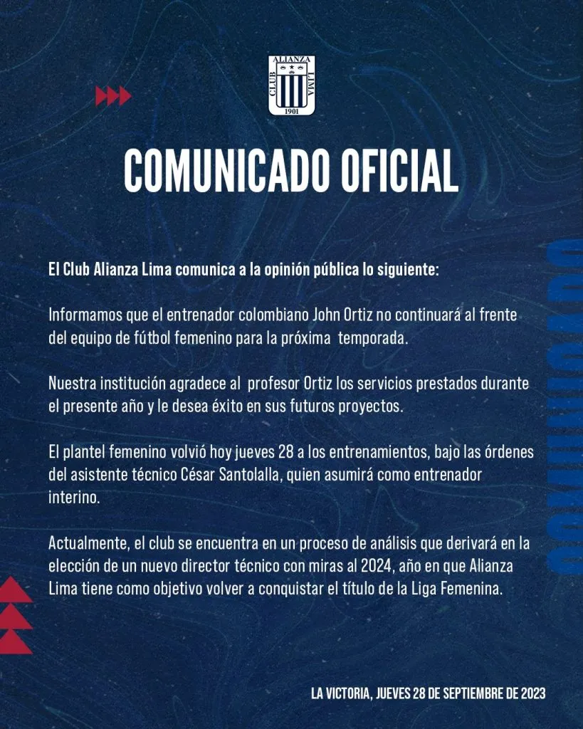 “El entrenador colombiano John Ortiz no continuará al frente del equipo de fútbol femenino para la próxima temporada. Nuestra institución agradece al profesor Ortiz los servicios prestados durante el presente año y le desea éxito en sus futuros proyectos”. Es el comunicado de Alianza Lima Femenino, en Twitter.