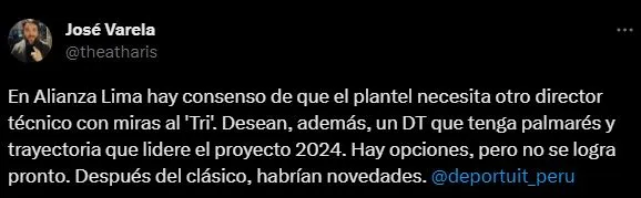 “En Alianza Lima hay consenso de que el plantel necesita otro director técnico con miras al ‘Tri’. Desean, además, un DT que tenga palmarés y trayectoria que lidere el proyecto 2024. Hay opciones, pero no se logra pronto. Después del clásico, habrían novedades”. Explica el comunicador social en su cuenta de Twitter.