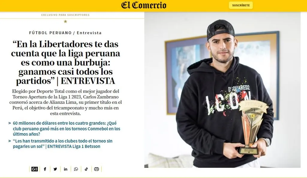 Volviendo a lo actual, El Comercio lo entrevistó y le entregó un premio especial: “Elegido por Deporte Total como el mejor jugador del Torneo Apertura de la Liga 1 2023, Carlos Zambrano conversó acerca de Alianza Lima, su primer título en el Perú, el objetivo del tricampeonato y mucho más en esta entrevista”.