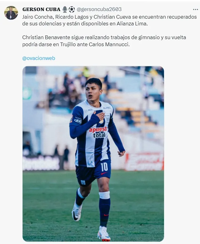 “Jairo Concha, Ricardo Lagos y Christian Cueva se encuentran recuperados de sus dolencias y están disponibles en Alianza Lima”, comentó en un principio Gerson Cuba.