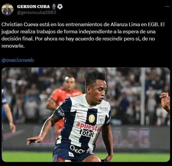 Lo cuenta el periodista Gerson Cuba, desde Radio Ovación se dio la información sobre el caso Aladino: “Christian Cueva está en los entrenamientos de Alianza Lima en EGB. El jugador realiza trabajos de forma independiente a la espera de una decisión final. Por ahora no hay acuerdo de rescindir, pero sí, de no renovarle”.