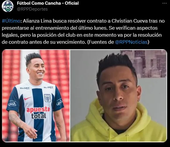 Con la premisa mencionada, la información de Kevin Pacheco es certera: “Último: Alianza Lima busca resolver contrato a Christian Cueva tras no presentarse al entrenamiento del último lunes. Se verifican aspectos legales, pero la posición del club en este momento va por la resolución de contrato antes de su vencimiento. (Fuentes de RPP Noticias)”.
