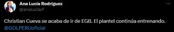 Hasta ahí todo estaba bien, pero ante esta acción, el propio jugador tuvo su reacción. Christian Cueva hace algo que lo puede sepultar, y lo confirma Ana Lucía Rodríguez en su cuenta de Twitter: “Christian Cueva se acaba de ir de EGB. El plantel continúa entrenando”. ¿Su historia tiene final en Alianza Lima?