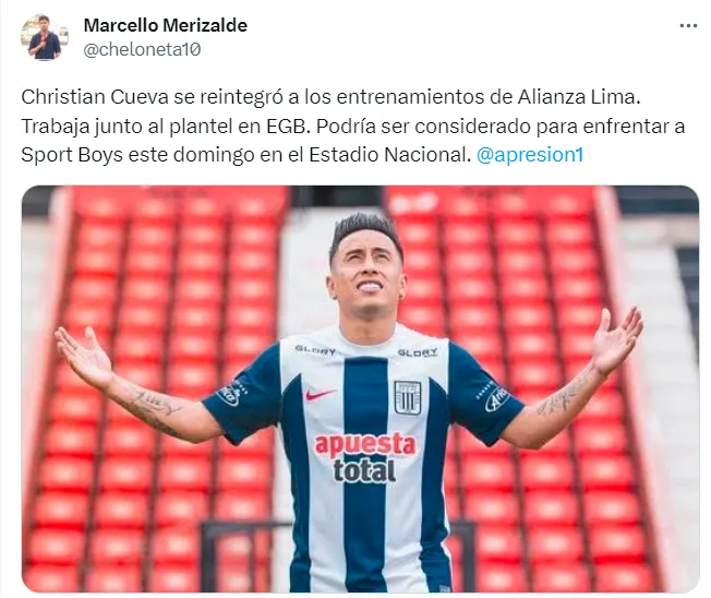 “Christian Cueva se reintegró a los entrenamientos de Alianza Lima. Trabaja junto al plantel en EGB. Podría ser considerado para enfrentar a Sport Boys este domingo en el Estadio Nacional”, comentó el comunicador.