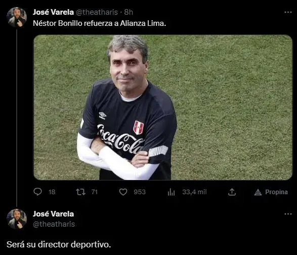 Ahora, volvemos a la gran novedad en el equipo del pueblo. Una bomba mediática es contada en su cuenta de Twitter, el periodista deportivo José Varela: “ALIANZA LIMA ficha a Néstor Bonillo. Será el asesor deportivo de los blanquiazules”.