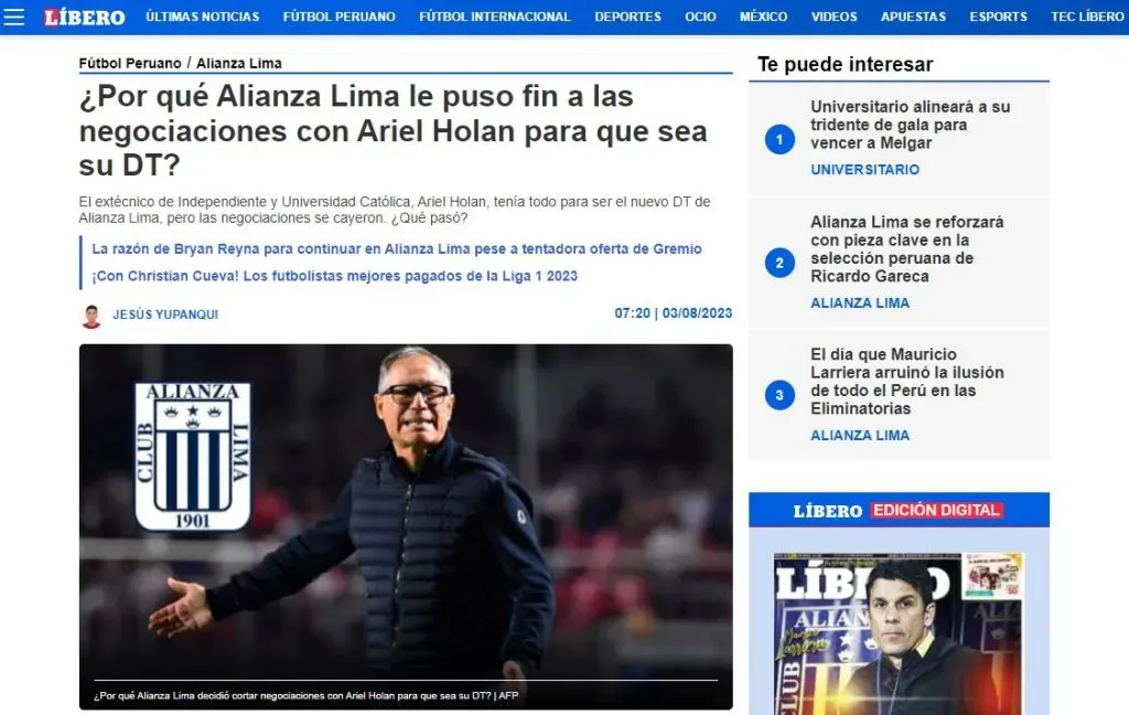 Dentro del portal web del medio de comunicación se puede ver: “Diego Sotomayor, periodista de Líbero, contó que Alianza Lima habló con Ariel Holan, Robert Moreno y Mauricio Larriera. Pero diversos factores llevaron a que las conversaciones no continúen con el DT argentino”.