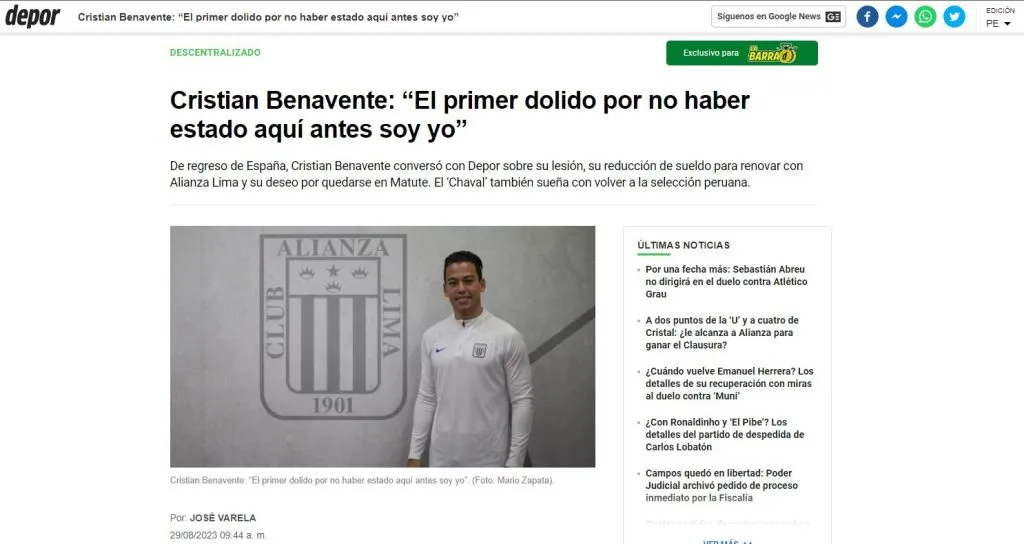 Pronto veremos su regreso a las canchas, su talento servirá para llenar los corazones del hincha de Alianza Lima. Cristian Benavente se encuentra en la fase final de su recuperación, y por eso, se expresó sobre este tema, entre otros, con la prensa especializada.