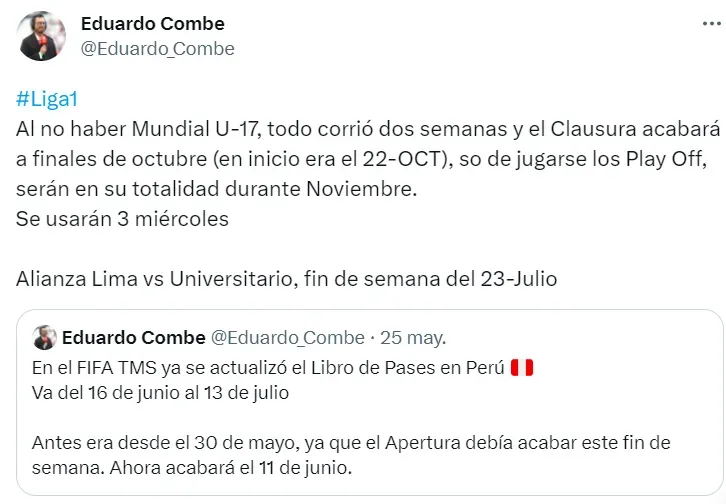 Según el periodista Eduardo Combe, el clásico entre Alianza Lima y Universitario de Deportes, que se jugará por la fecha 5 el Torneo Clausura se estaría disputando el 23 de julio.