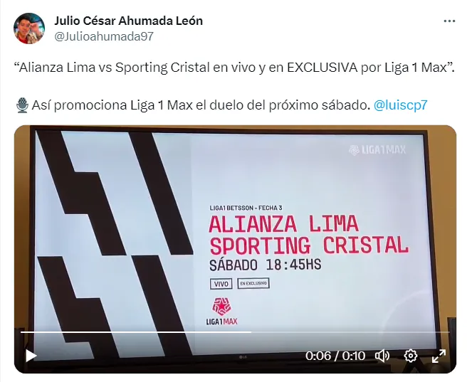 “Alianza Lima vs Sporting Cristal en vivo y en EXCLUSIVA por Liga 1 Max. Así promociona Liga 1 Max el duelo del próximo sábado”, escribió el comunicador en su cuenta oficial de Twitter.