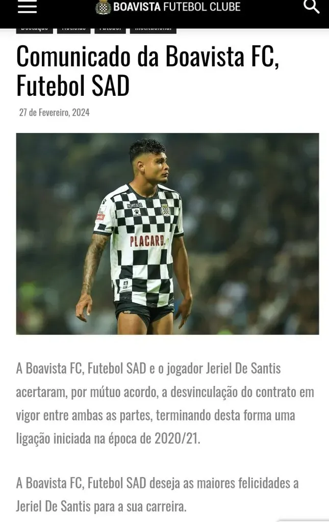 Desde Portugal, el propio club anuncia la salida definitiva de su futbolista. Quien llegó hace algunas temporadas, y parecía tener una proyección sumamente interesante. Ahora estará con los íntimos de La Victoria: “Boavista FC, Futebol SAD y el jugador Jeriel De Santis acordaron, de común acuerdo, liberar el contrato vigente entre ambas partes, poniendo así fin a una vinculación que comenzó en la temporada 2020/21”.