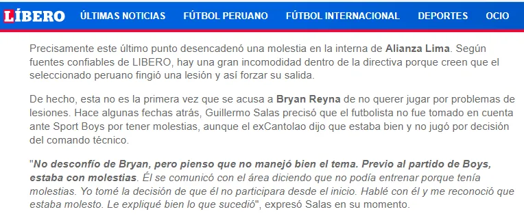Cabe recordar que hace algunas fechas atrás, Guillermo Salas mencionó que Reyna no fue tomado en cuenta ante Sport Boys por tener molestias, aunque el exCantolao lanzó un puñal al asegurar que se encontraba bien y no jugó por decisión del comando técnico.