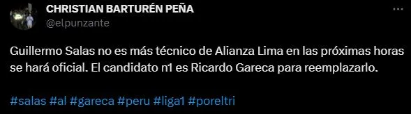 “Guillermo Salas no es más técnico de Alianza Lima en las próximas horas, se hará oficial. El candidato n1 es Ricardo Gareca para reemplazarlo”, escribió el comunicador a través de sus redes sociales.
