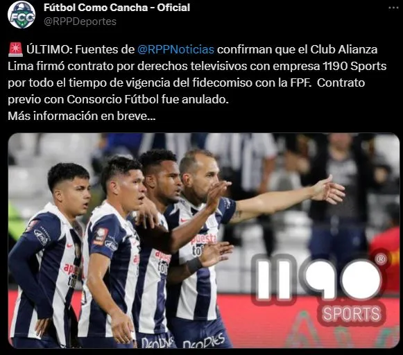 RPP Noticias anunció en su cuenta de Twitter así la gran primicia: “ÚLTIMO: Fuentes de RPP Noticias confirman que el Club Alianza Lima firmó contrato por derechos televisivos con la empresa 1190 Sports por todo el tiempo de vigencia del fideicomiso con la FPF. Contrato previo con Consorcio Fútbol fue anulado. Más información en breve”. Y así terminó sucediendo minutos después.