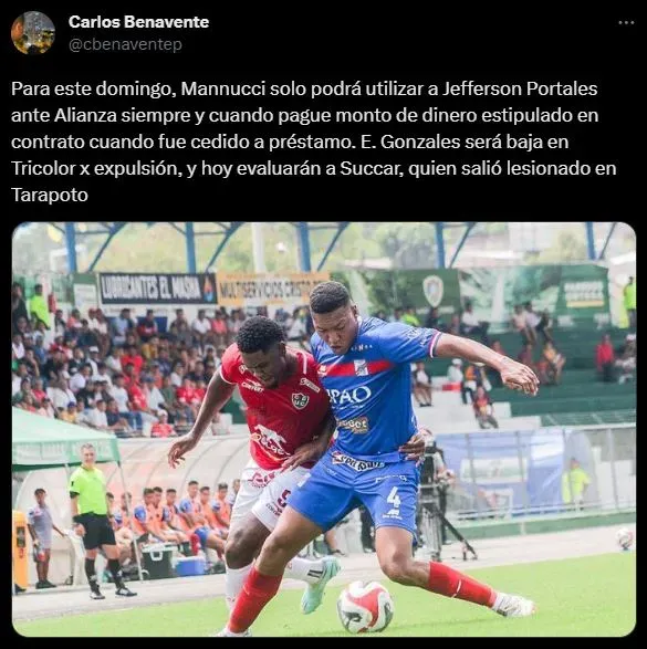 Por eso, es muy importante leer lo que se explica a continuación: “Para este domingo, Mannucci solo podrá utilizar a Jefferson Portales ante Alianza, siempre y cuando pague el monto de dinero estipulado en contrato cuando fue cedido a préstamo. E. Gonzales será baja en Tricolor por expulsión, y hoy evaluarán a Succar, quien salió lesionado en Tarapoto”.