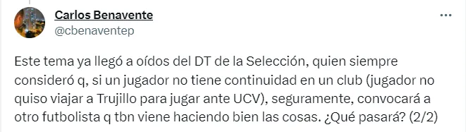 “Este tema ya llegó a oídos del DT de la Selección, quien siempre consideró que, si un jugador no tiene continuidad en un club (jugador no quiso viajar a Trujillo para jugar ante UCV), seguramente, convocará a otro futbolista que también viene haciendo bien las cosas. ¿Qué pasará?”, añadió.