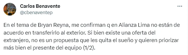 “En el tema de Bryan Reyna, me confirman que en Alianza Lima no están de acuerdo en transferirlo al exterior. Si bien existe una oferta del extranjero, no es una propuesta que les quita el sueño y quieren priorizar más bien el presente del equipo”, escribió el comunicador.