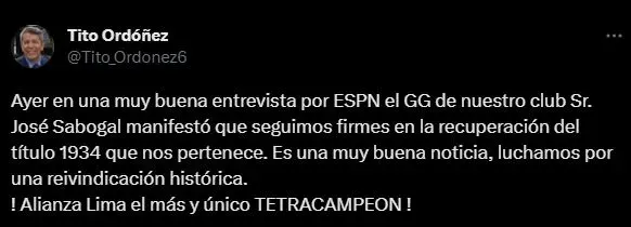 “Ayer en una muy buena entrevista por ESPN el GG de nuestro club Sr. José Sabogal manifestó que seguimos firmes en la recuperación del título 1934 que nos pertenece. Es una muy buena noticia, luchamos por una reivindicación histórica. ¡Alianza Lima es el más y único TETRACAMPEÓN!”. Explicó el buen Tito Ordoñez.