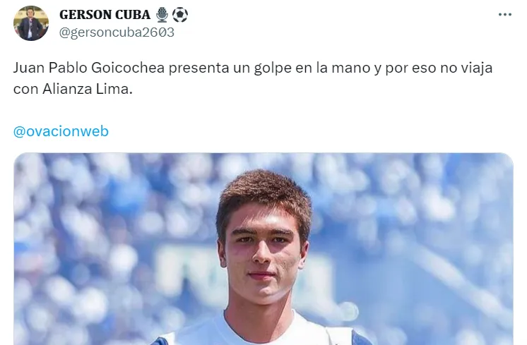“Juan Pablo Goicochea presenta un golpe en la mano y por eso no viaja con Alianza Lima”, escribió el comunicador en su cuenta oficial de Twitter.