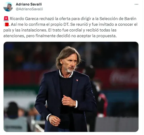 “Ricardo Gareca rechazó la oferta para dirigir a la Selección de Baréin. Así me lo confirmó el propio DT. Se reunió y fue invitado a conocer el país y las instalaciones. El trato fue cordial y recibió todas las atenciones, pero finalmente decidió no aceptar la propuesta”, indicó el comunicador.