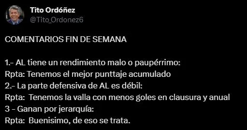 Finalmente, y no menos importante, para Tito Ordoñez, con el paso de las fechas Alianza Lima se ganó el respeto de sus principales rivales. Todas las críticas tuvieron contestación, con esta vemos cerrando: “3 – Ganan por jerarquía. Respuesta: Buenísimo, de eso se trata”.