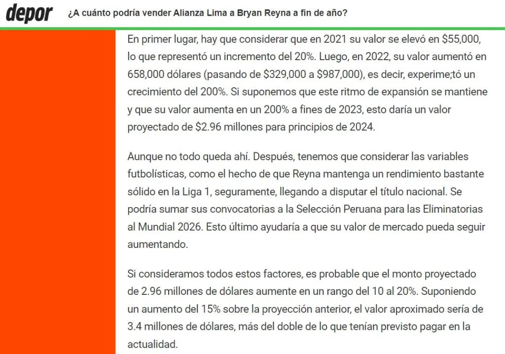 Así lo reveló el diario Depor en su versión web. En una nota del periodista Franz Tamayo, el hombre de prensa realizó un cálculo de la proyección económica que podría tener Bryan Reyna y cuánto costaría su pase a fin de año.