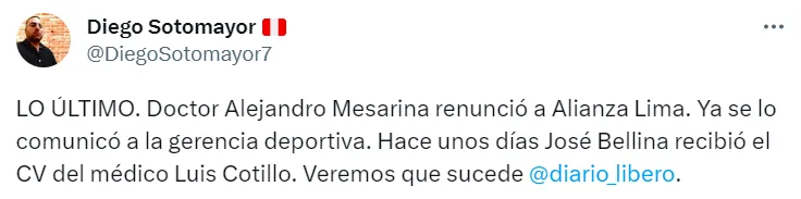 “LO ÚLTIMO. El doctor Alejandro Mesarina renunció a Alianza Lima. Ya se lo comunicó a la gerencia deportiva. Hace unos días José Bellina recibió el CV del médico Luis Cotillo. Veremos que sucede”, escribió el comunicado.